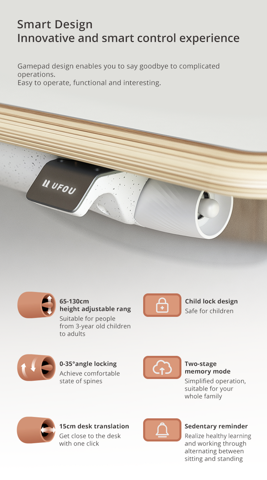 The UPON MINI is engineered for ultimate flexibility. Its standard height range of 650mm to 1300mm allows easy adjustments to find your ideal working position. Additionally, the desktop tilt angle ranges from 0° to 35°, accommodating various activities from typing to sketching. Say goodbye to discomfort and hello to a personalized workspace!