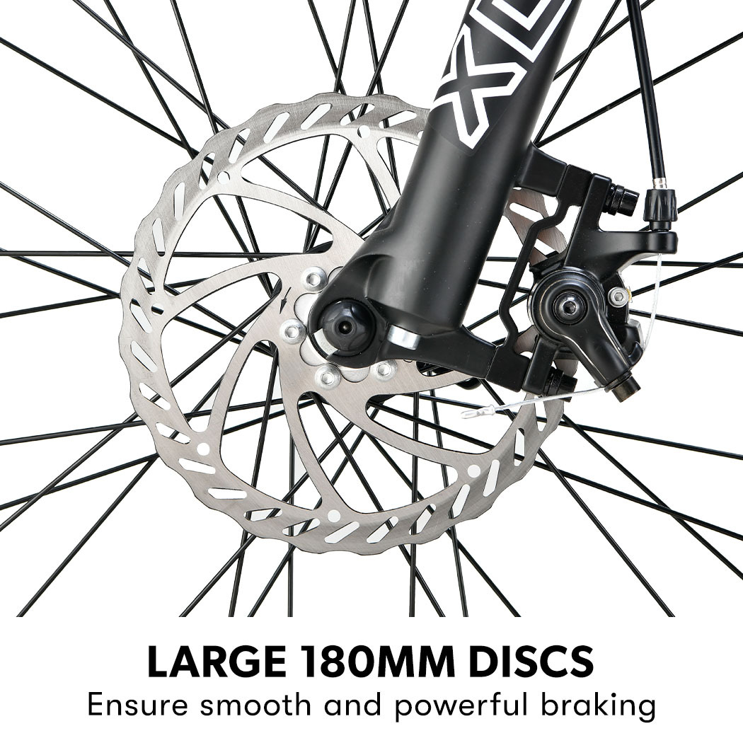 The Valk MX7 comes with front and rear disc brakes, providing reliable stopping power when you need it most. The adjustable XDT front suspension forks offer additional cushioning, allowing you to tackle rocky terrains effortlessly. Plus, the high-traction 27.5” Maxxis Pace tires give you the grip needed for tight turns and slippery conditions.