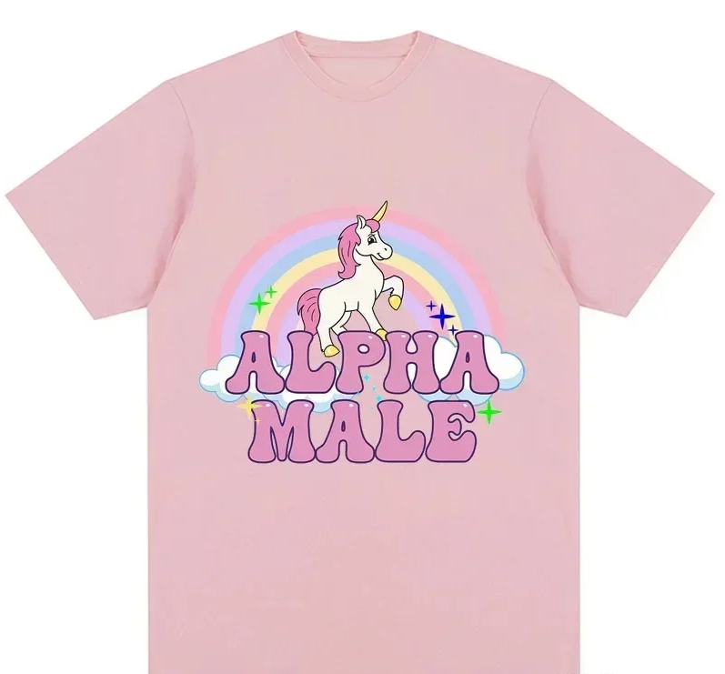 Design: Full-colour rainbow unicorn graphic with “Alpha Male” text