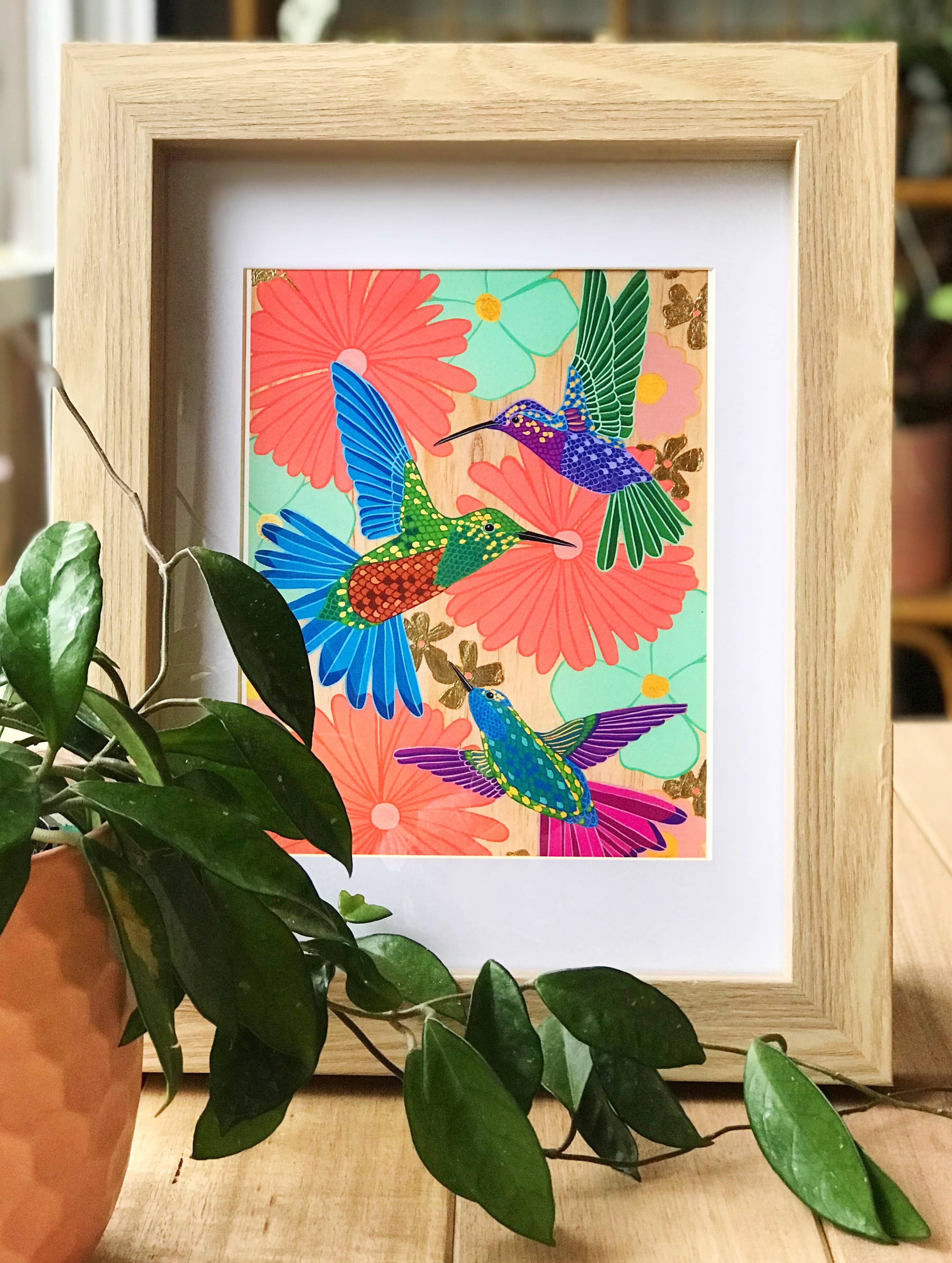 These colourful little humming birds have been painted over a vintage floral backdrop creating a natural yet somewhat nostalgic feel.