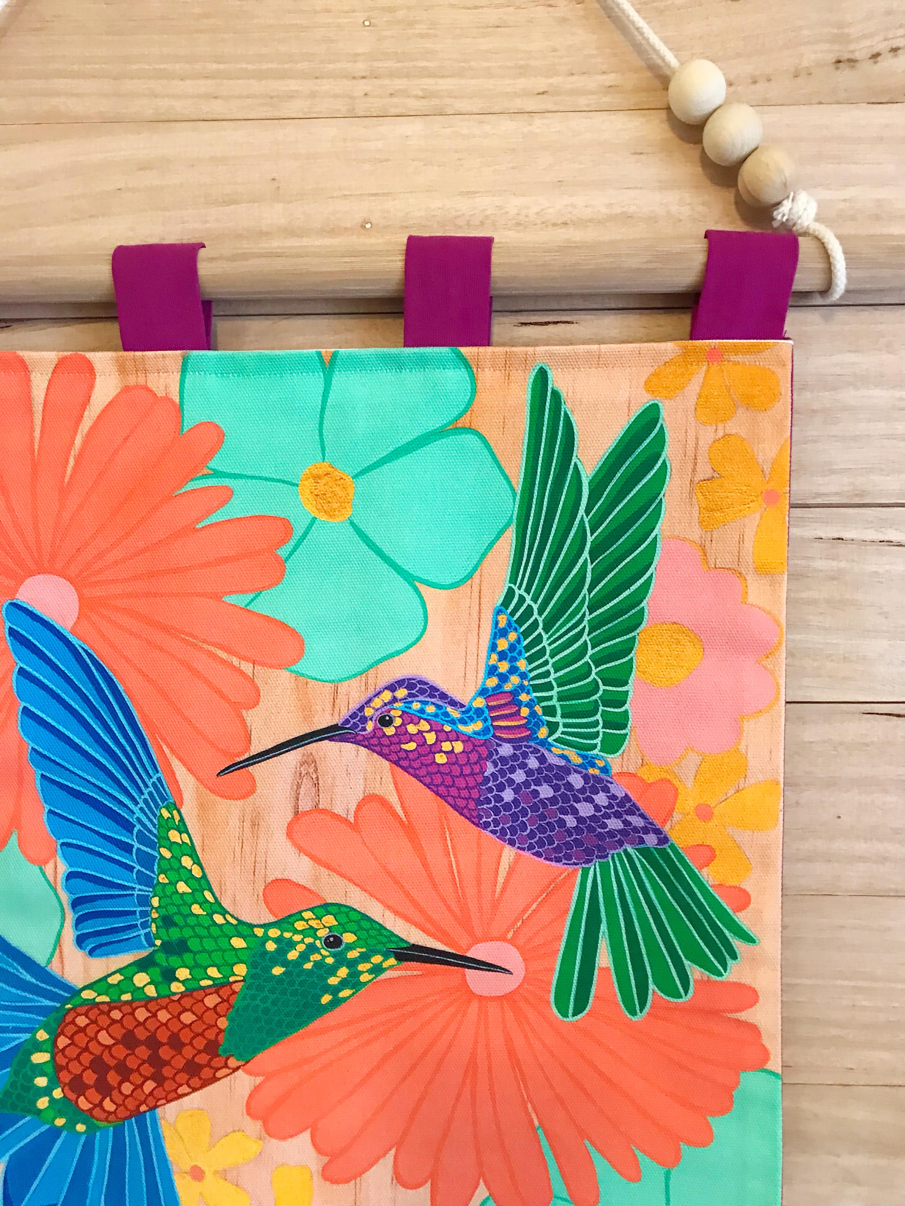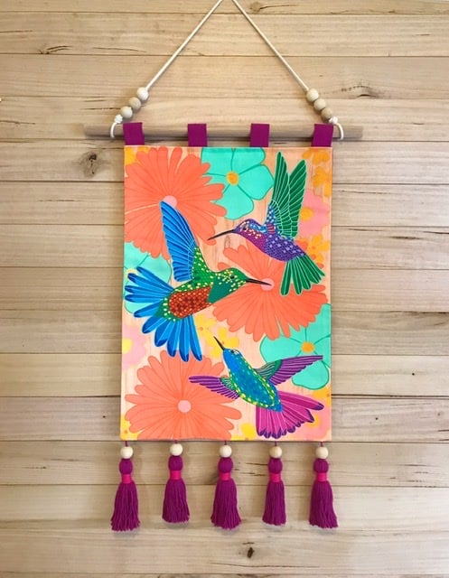 Purchase Australian Art Electric Hummingbird Wall Hanging by local Australian Artist Hola by Isabel online including Australiana and iconic artists prints, made locally in Melbourne Australia. Shop Now Handmade fabric wall hanging with tassels.