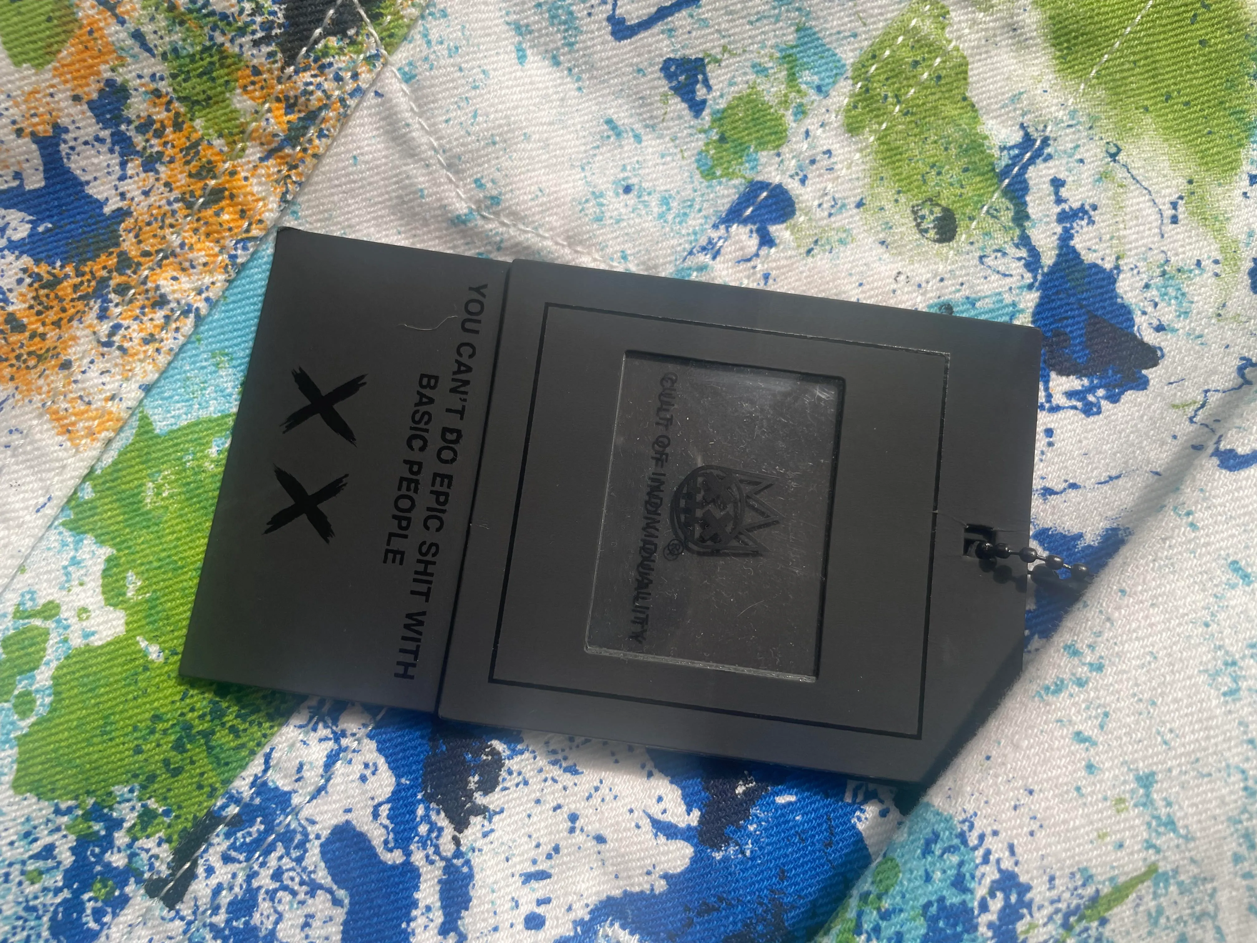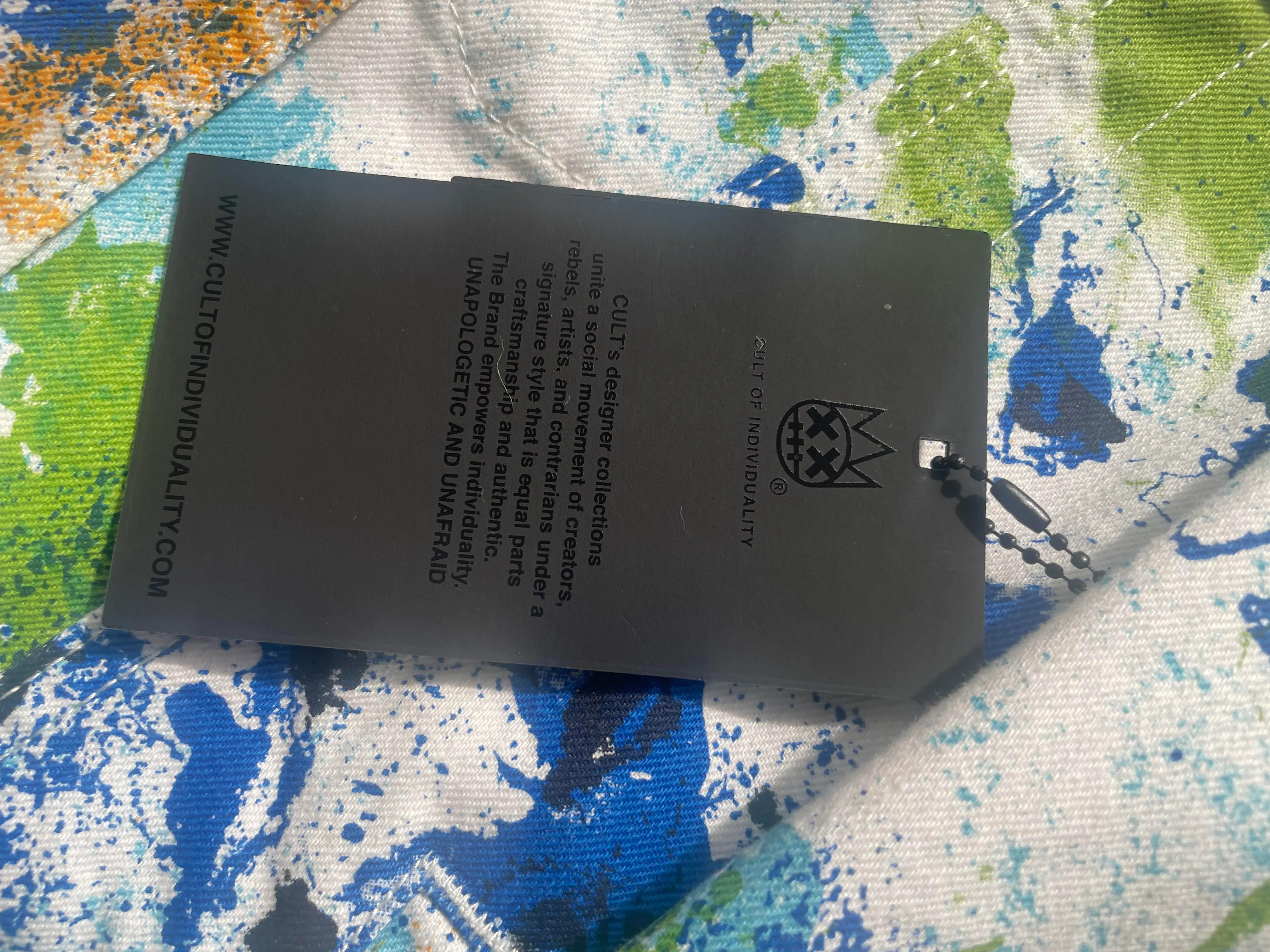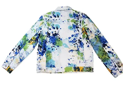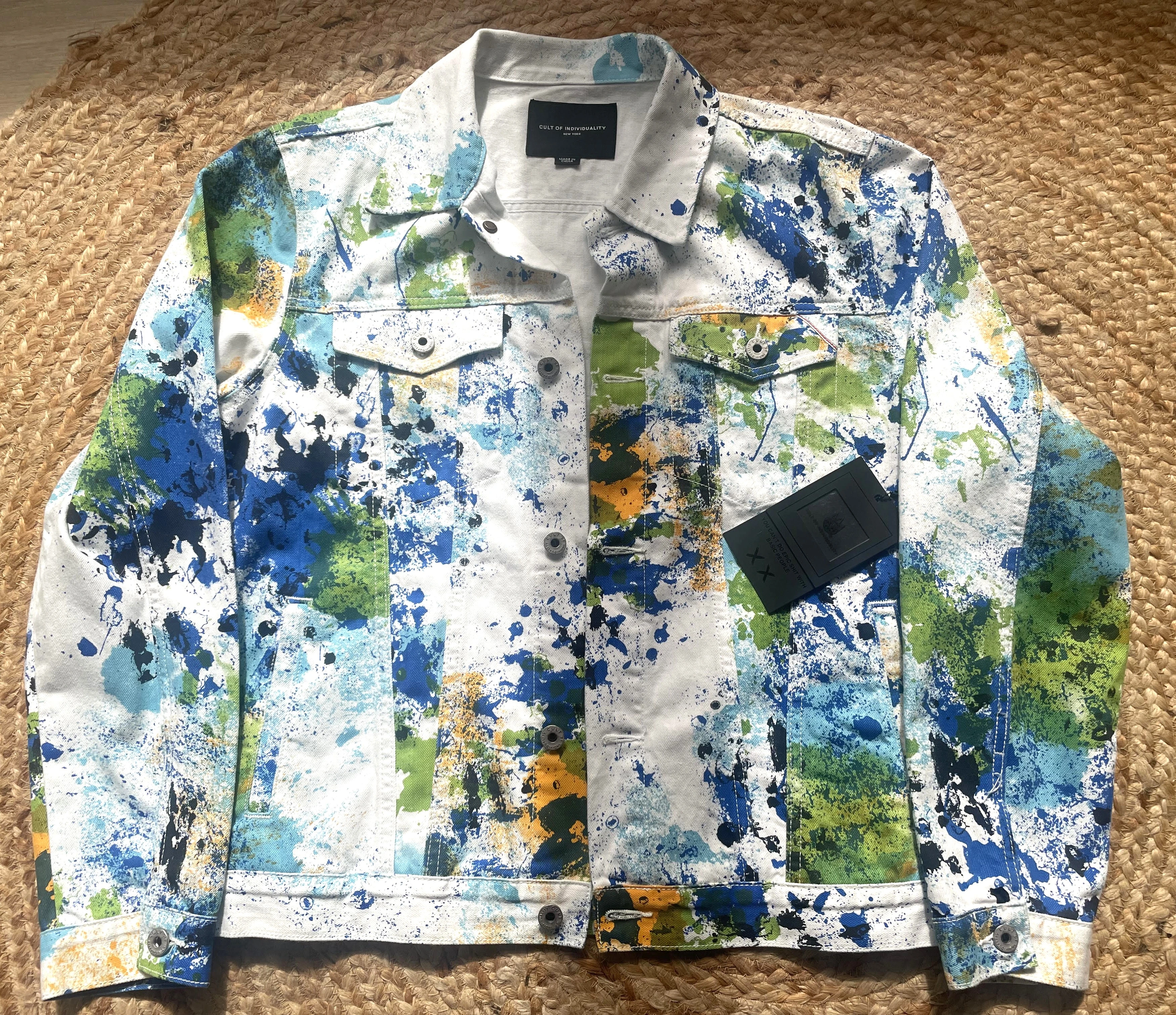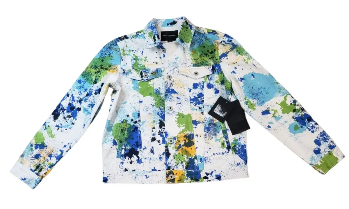 Discover the Authentic Cult of Individuality Splatter White Denim Trucker Jacket, a unique statement piece that combines style with a touch of rebellious splatter design.