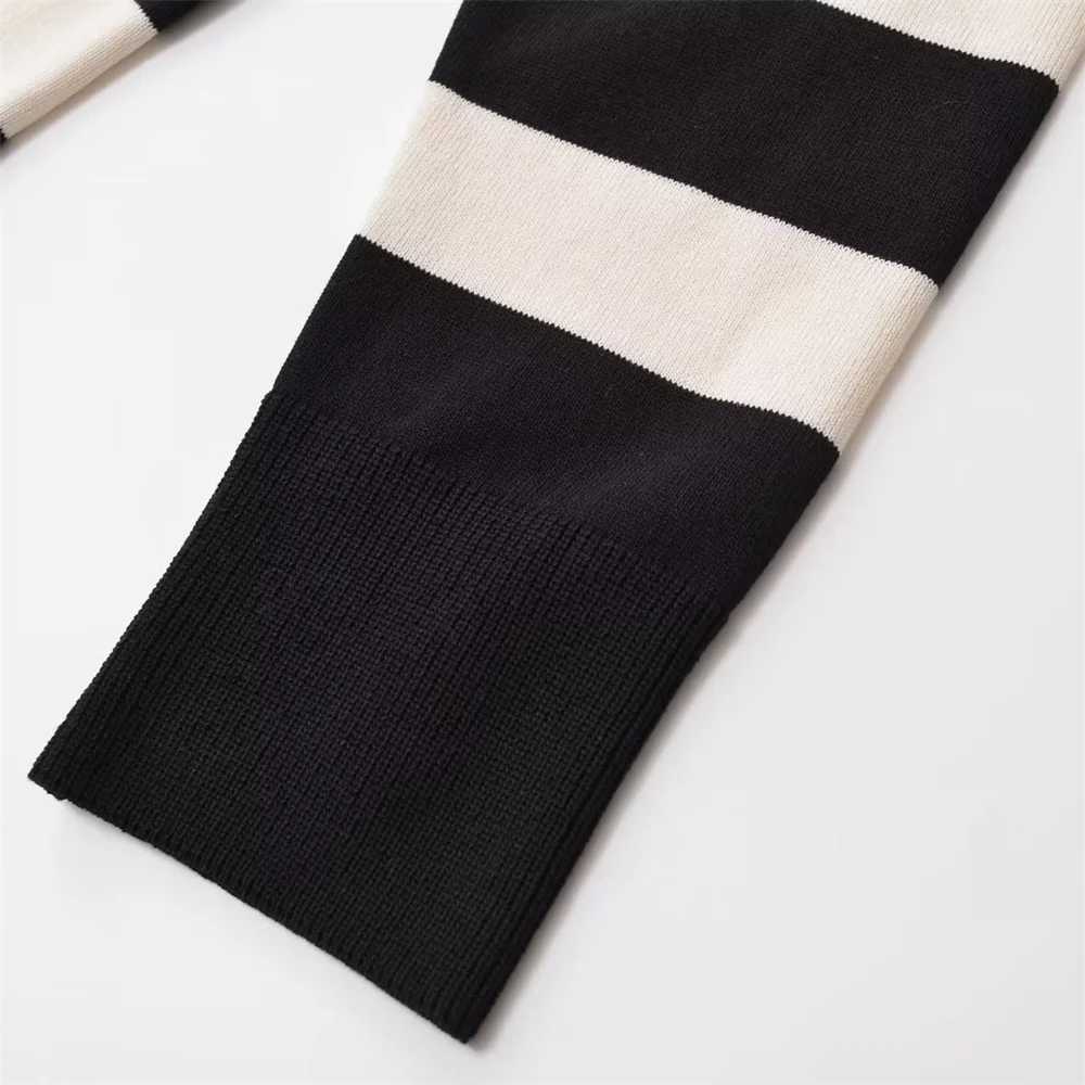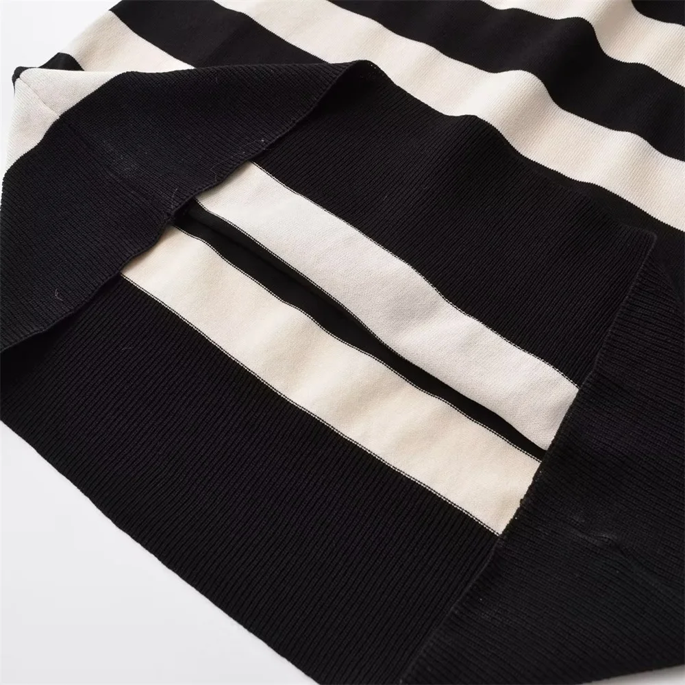 Women’s Casual Round Neck Long Sleeve Fashion Slim Knitted Sweater Dress Midi. Featuring a timeless black and white striped design.
