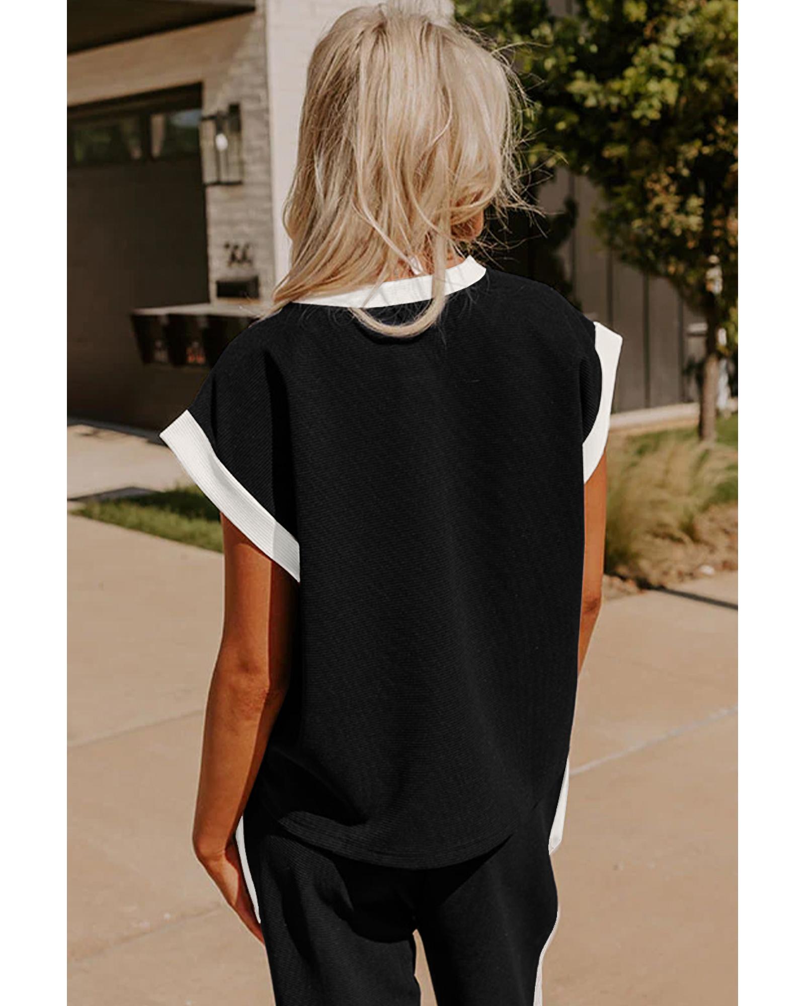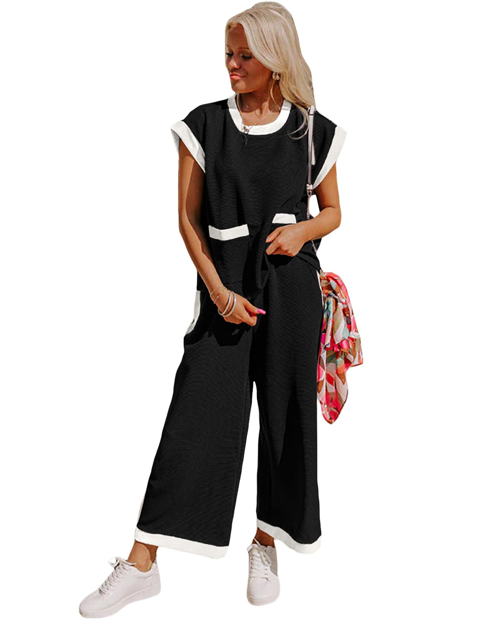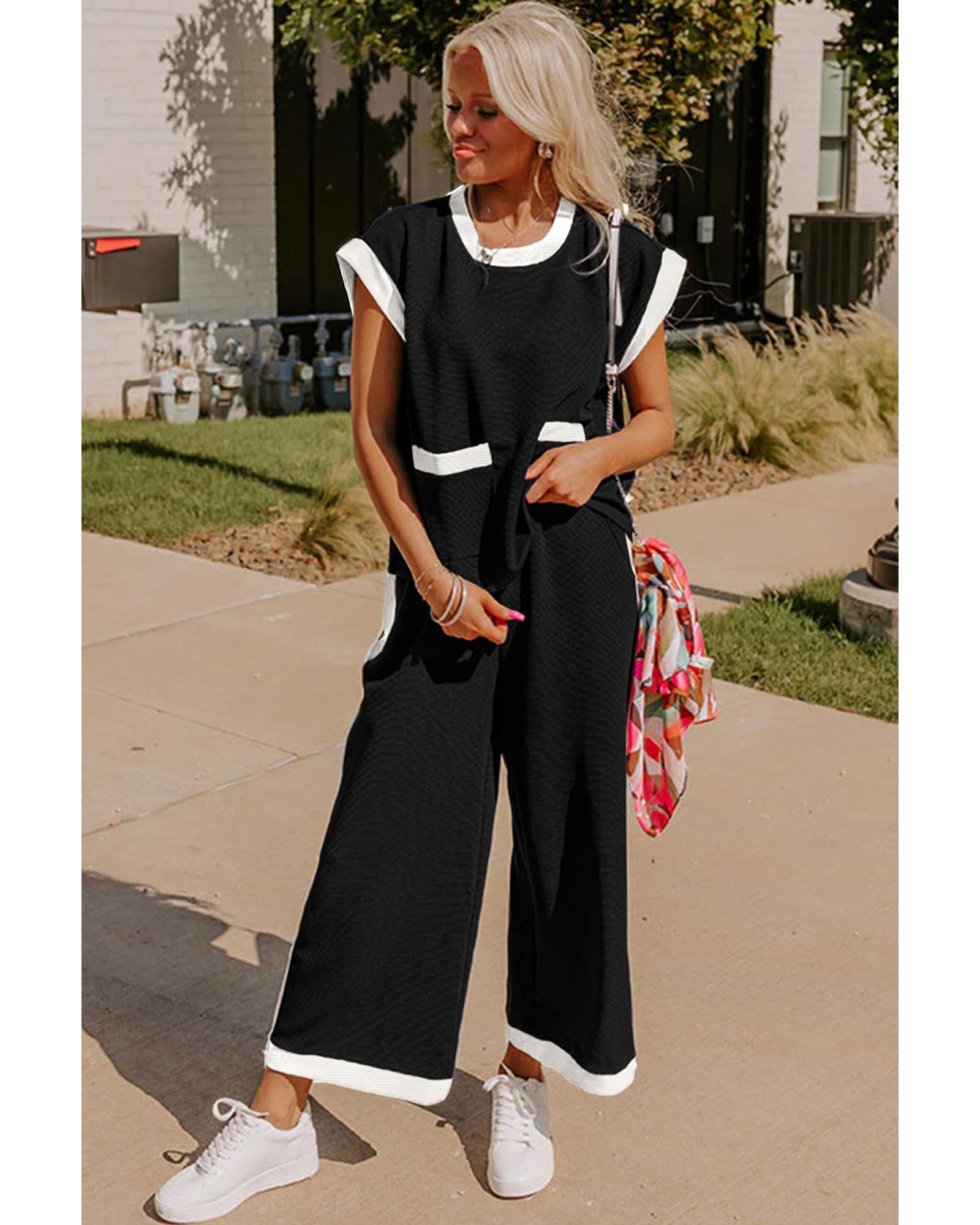 The Black Color Block Pocketed T-Shirt and Wide Leg Pants Set offers quality construction and a comfortable fit, catering to both style and practicality.
