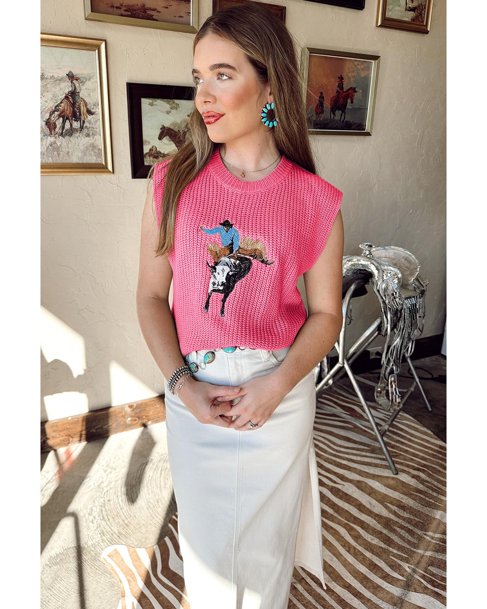 Bright Pink Western Cowboy Embroidery Round Neck Sleeveless Sweater