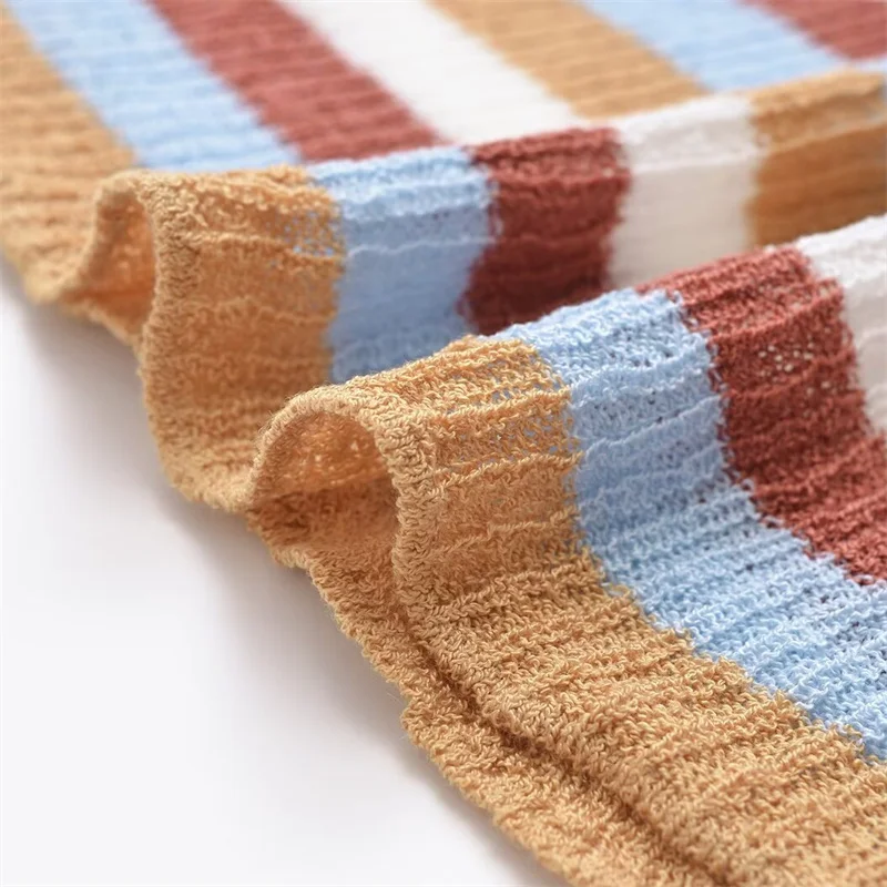 Offers a playful yet chic look for any occasion. This set features a vibrant candy-striped knit vest with a flattering sleeveless design, perfect for layering over your favorite tops or dresses.