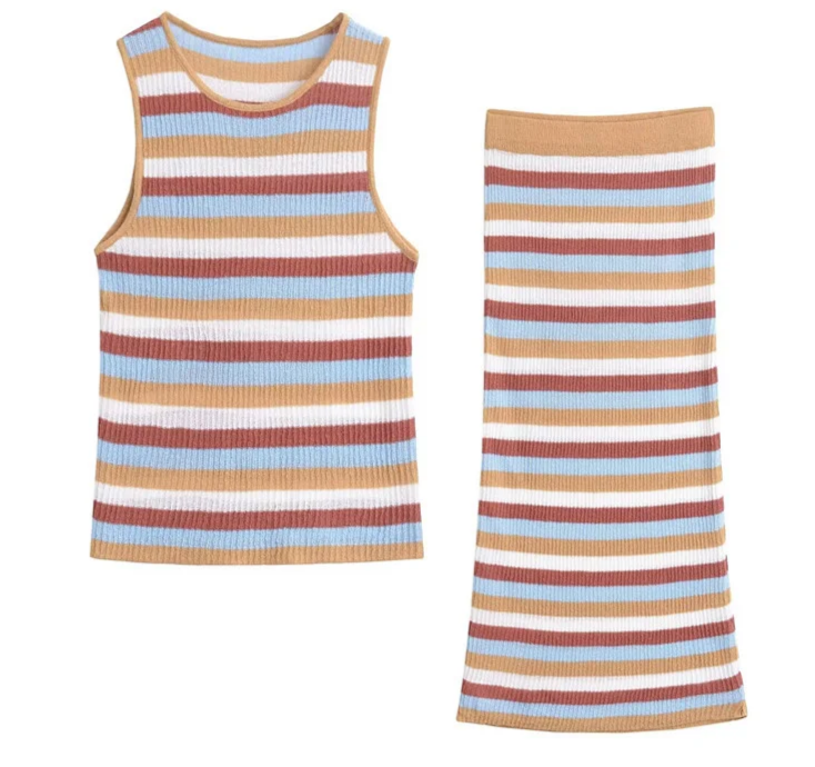 Elevate Your Wardrobe with the Candy Striped Knit Vest and Elastic Waist Knitted Straight Midi Skirt Two-Piece Set