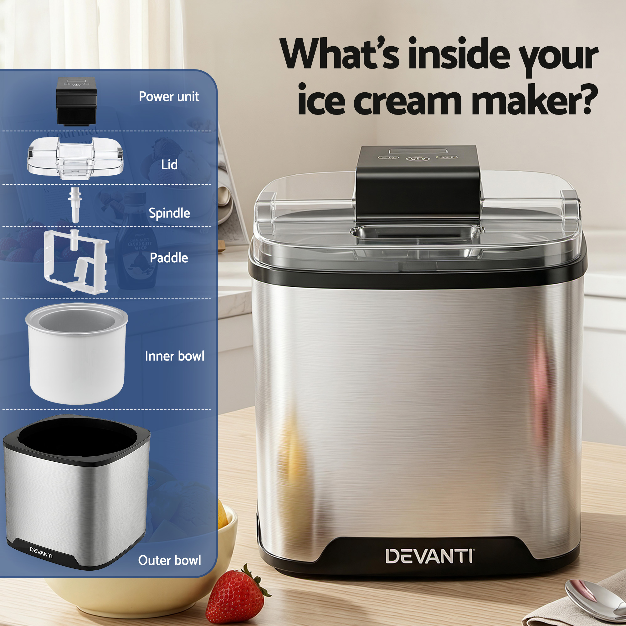 Your Devanti 2L Ice Cream Maker package comes with everything you need to start crafting your frozen desserts: