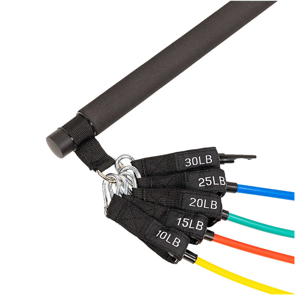 – Five Resistance Bands: 10lbs, 15lbs, 20lbs, 25lbs, and 30lbs