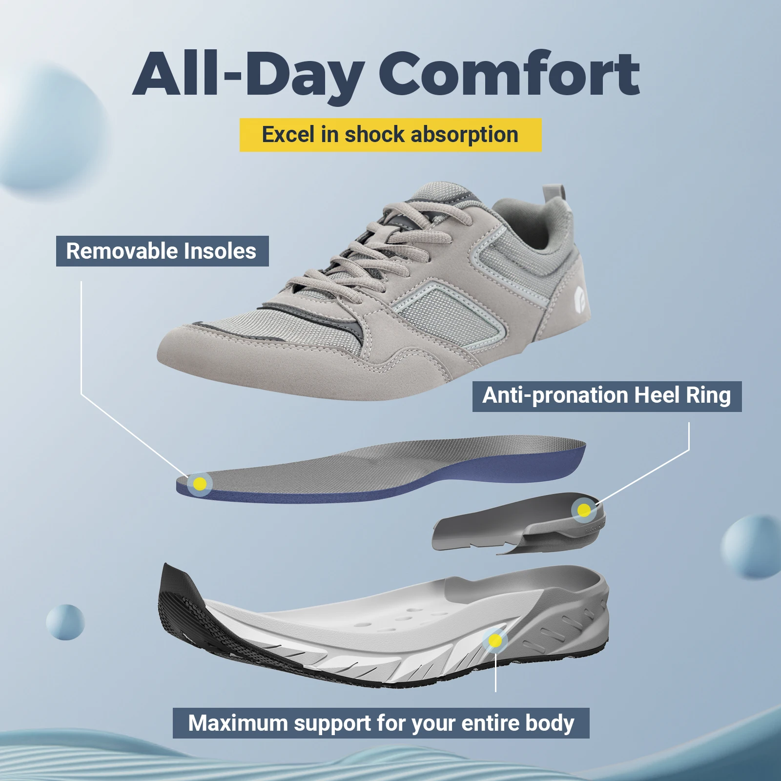 A spacious toe box allows your toes to splay naturally, reducing pressure and friction. Ideal for those with wide feet, high insteps, or foot conditions like bunions or plantar fasciitis.