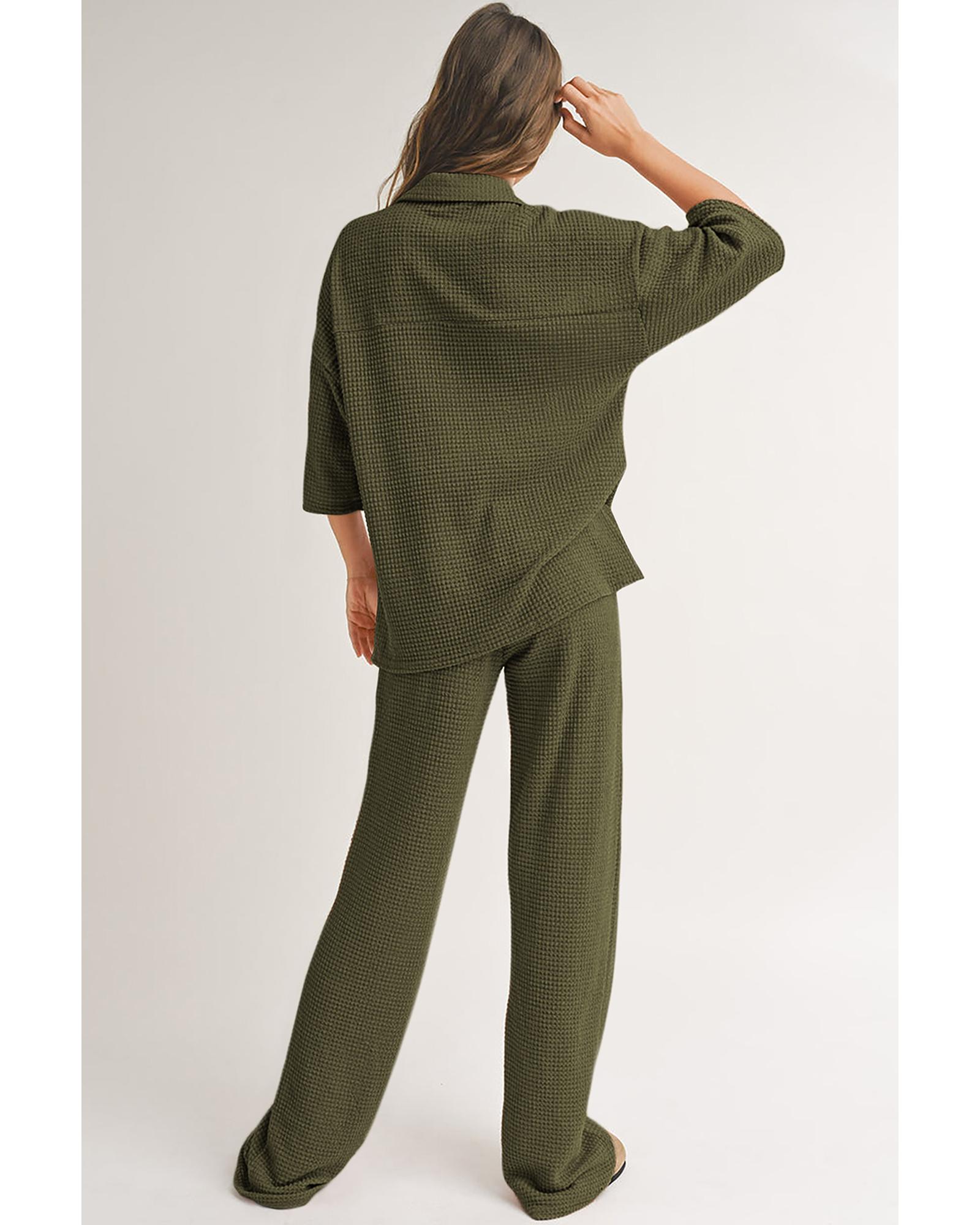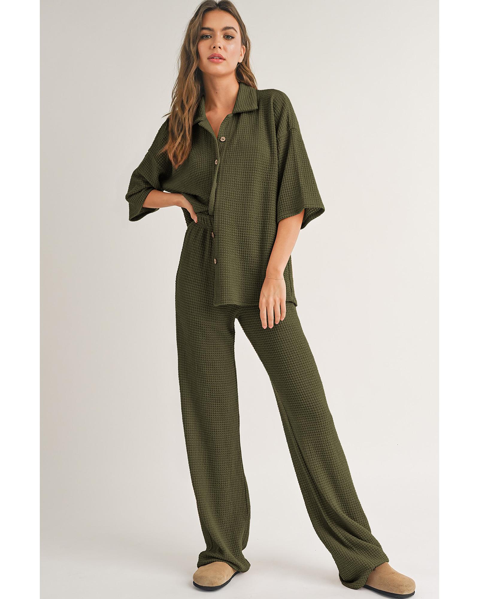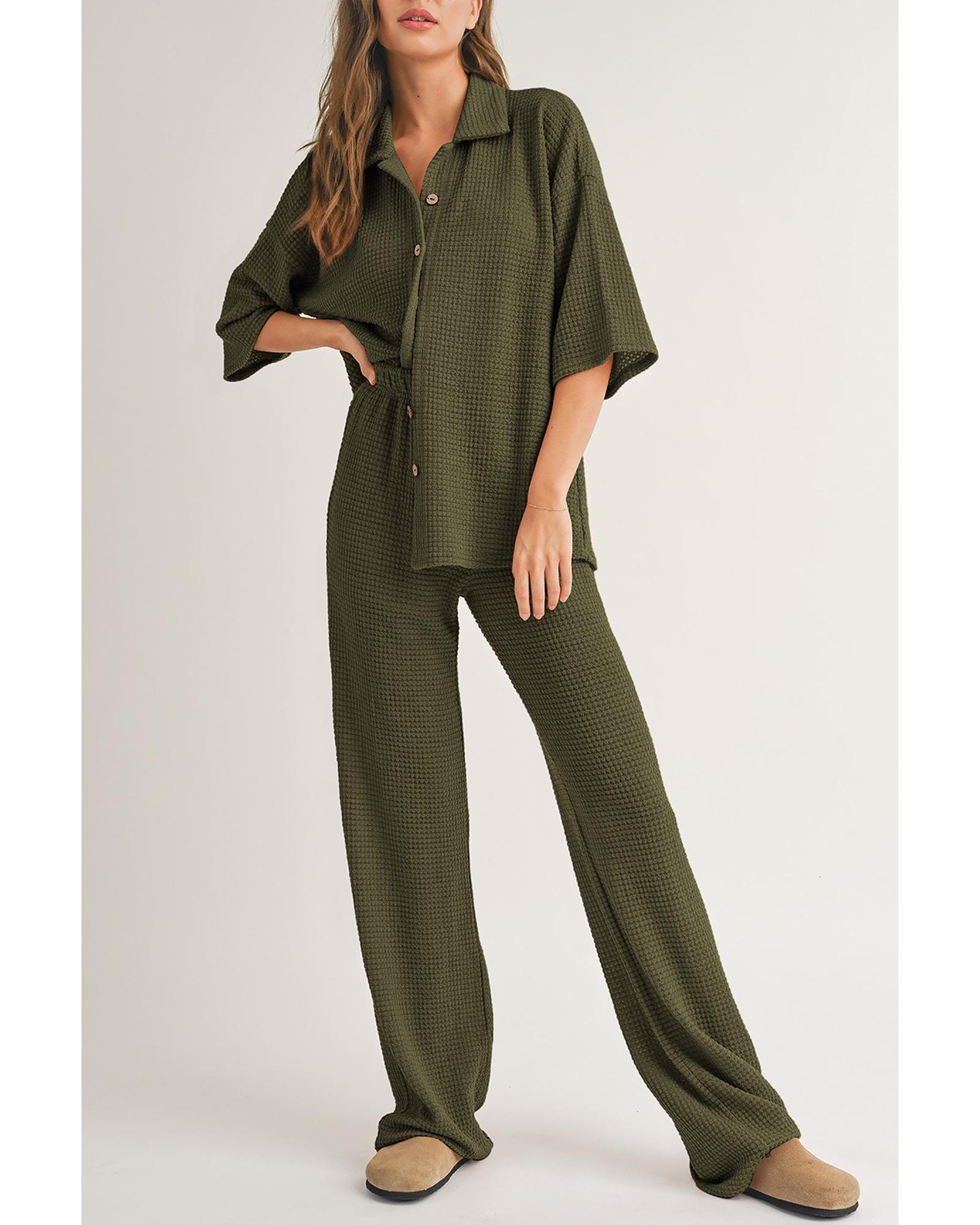 Four Leaf Clover Solid Color Textured Buttoned Shirt and Casual Pants Set
