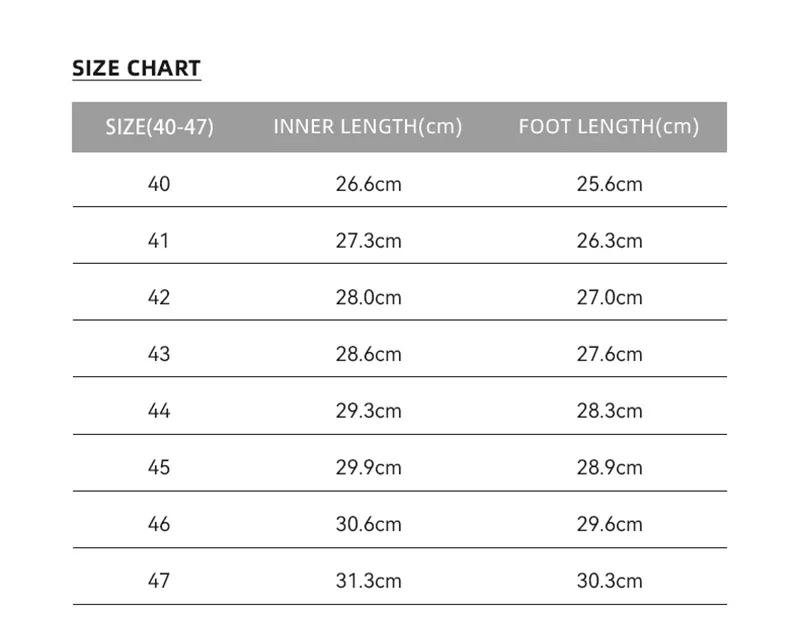 - Size Chart Based on Inner Length: The size chart below represents the inner length of the shoe, not the outer length. This ensures that you get the best fit based on the actual space inside the shoe.