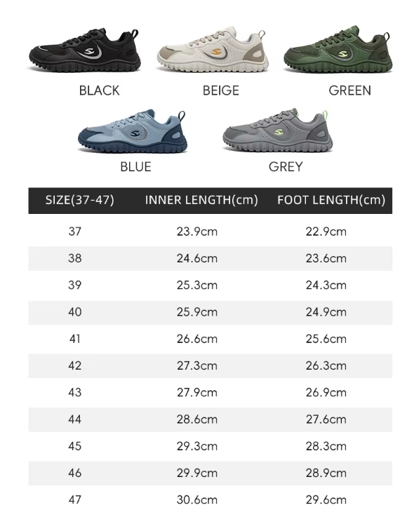 Reinforced Front Protection Artificial leather reinforcements at the toe and sides provide added durability and structure—perfect for uneven terrain or everyday wear.
