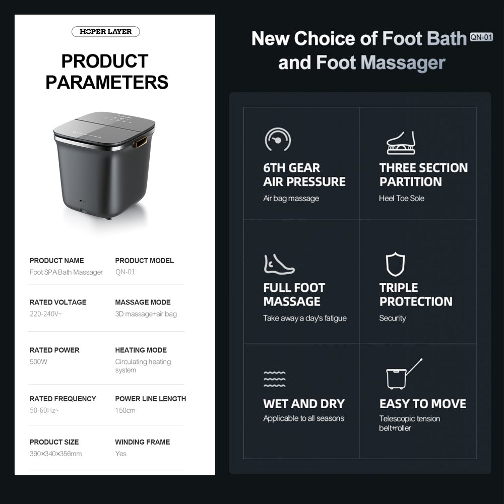 Indulge in total relaxation with the Hoper Layer Foot Bath Massager QN-01, offering a soothing, customizable foot massage experience with advanced safety features and effortless mobility.
