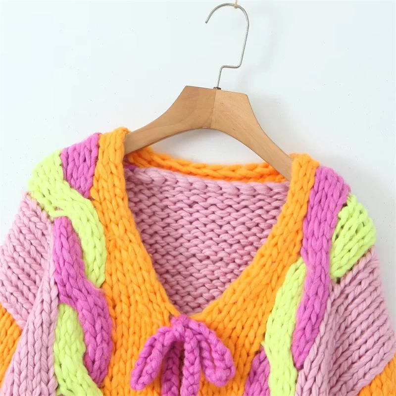 Featuring eye-catching contrast colors and a coarse yarn twist knit, this cardigan perfectly embodies bohemian style. It’s versatile enough to dress up or down, making it suitable for everything from cozy nights in to festive holiday gatherings. - Comfort Meets Functionality:
