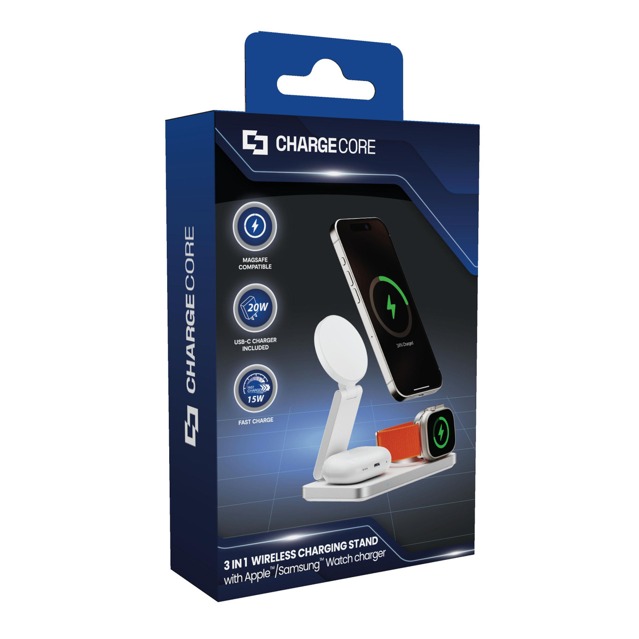 Ditch the cable mess and power up your phone, earbuds, and watch simultaneously with the sleek, foldable Laser ChargeCore 3-in-1 Wireless Charging Stand—perfect for any space and any tech-savvy lifestyle.