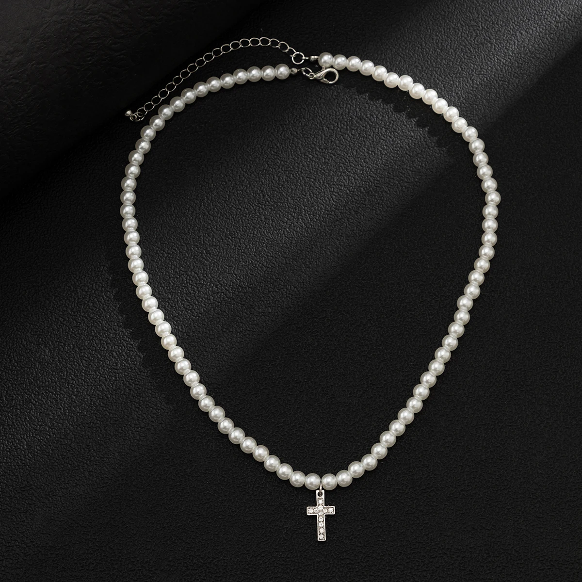 Men’s Pearl Beads Chain with Shiny Rhinestone Cross Necklace