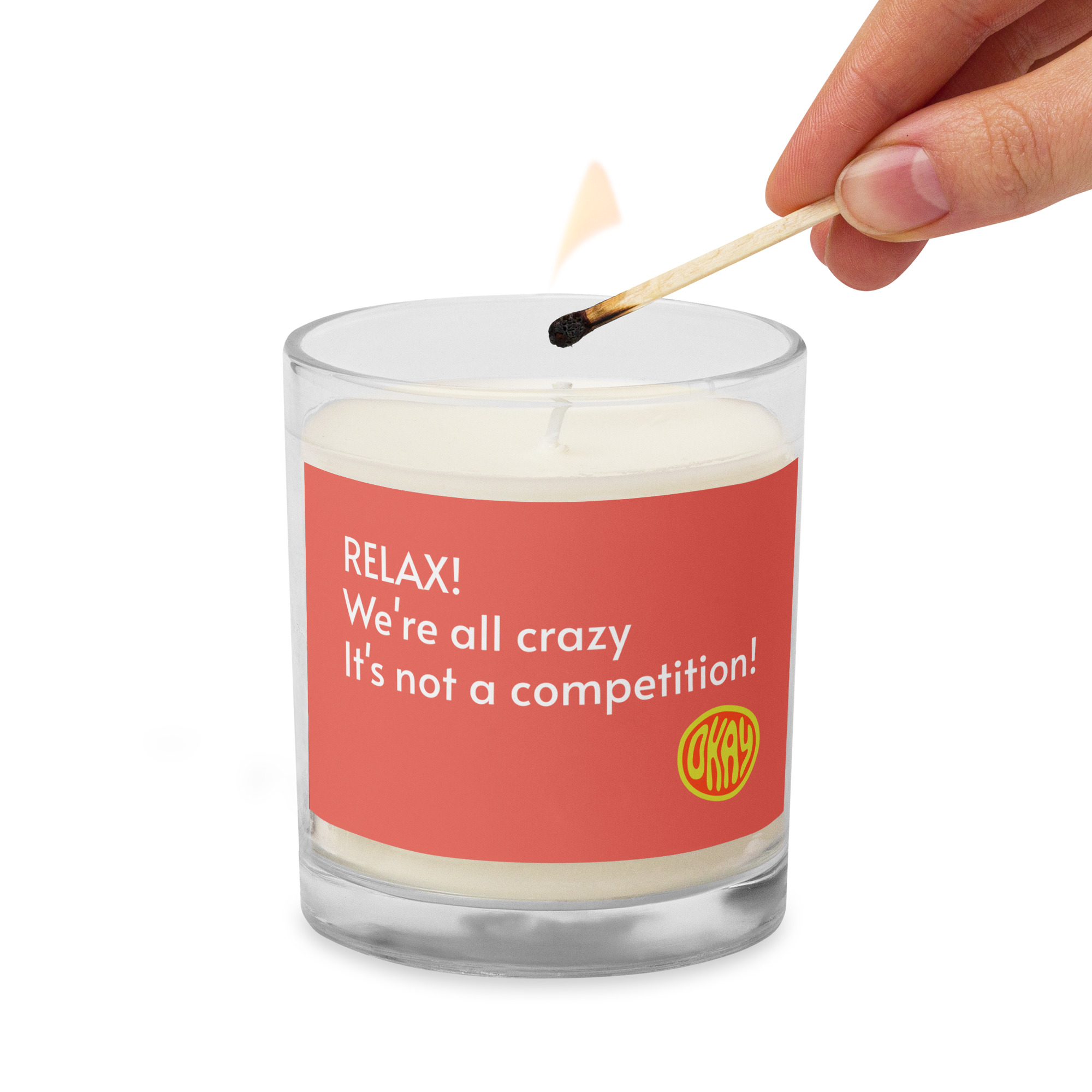 Shop the Relax We’re all crazy – Sarcastic Candle With its sleek glass jar, this candle functions as stylish home decor. Light it up and watch how its soft glow brings the room to life!