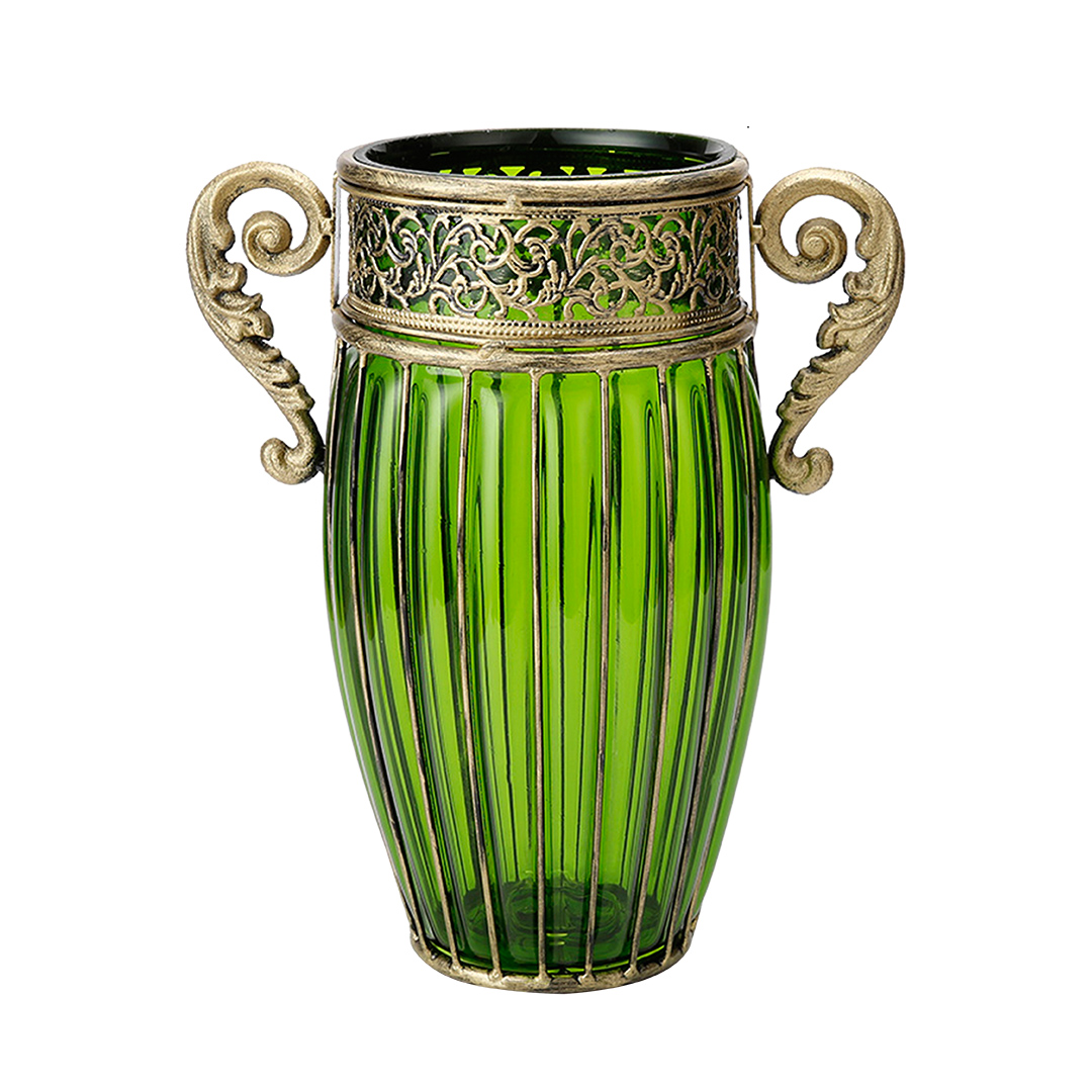 SOGA Green European Glass Vase with Metal Handles