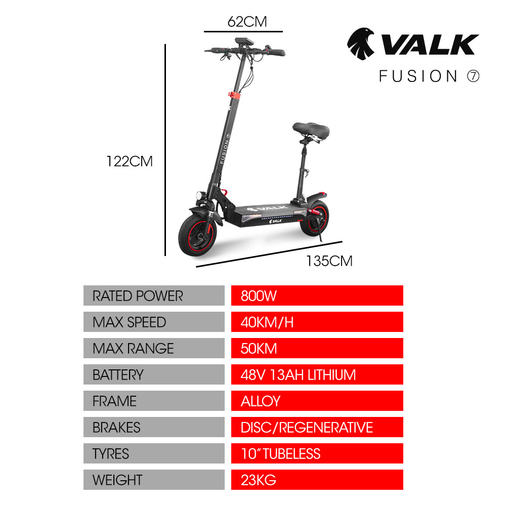 Valk Fusion 7 Electric Scooter with Seat, 800W Power, 50km Range