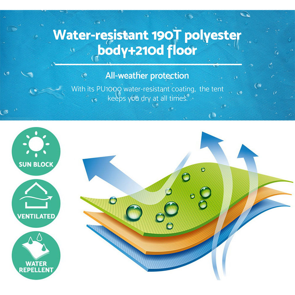 Constructed from heavy-duty 190T water-resistant fabric, this tent is designed to withstand various weather conditions, ensuring that you stay dry and comfortable whether it’s raining or shining. The silver-lined interior not only enhances brightness but also reflects heat, making it more comfortable to use during warmer days.