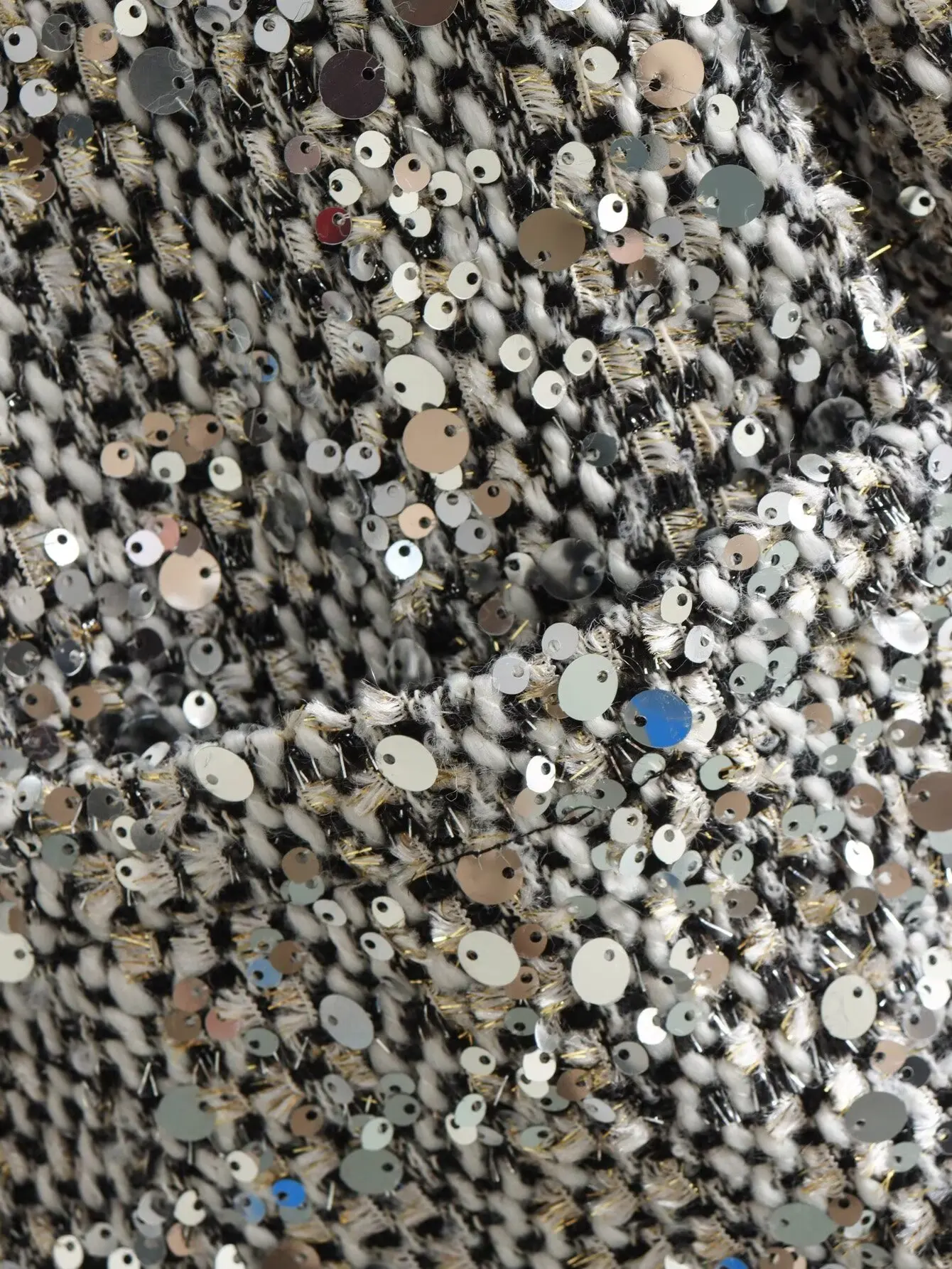 Women’s Sequin Tweed Round Collar Vintage Jacket. Crafted with luxurious tweed fabric and shimmering sequin embellishments, this jacket exudes timeless elegance and sophistication.
