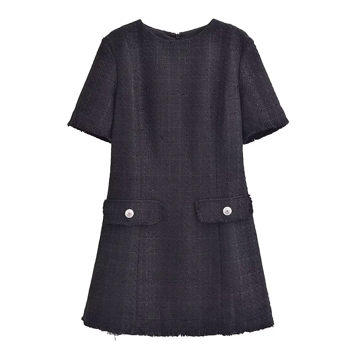 Womens Classic Black or White Short sleeve Tweed Mini Dress with Button Detail