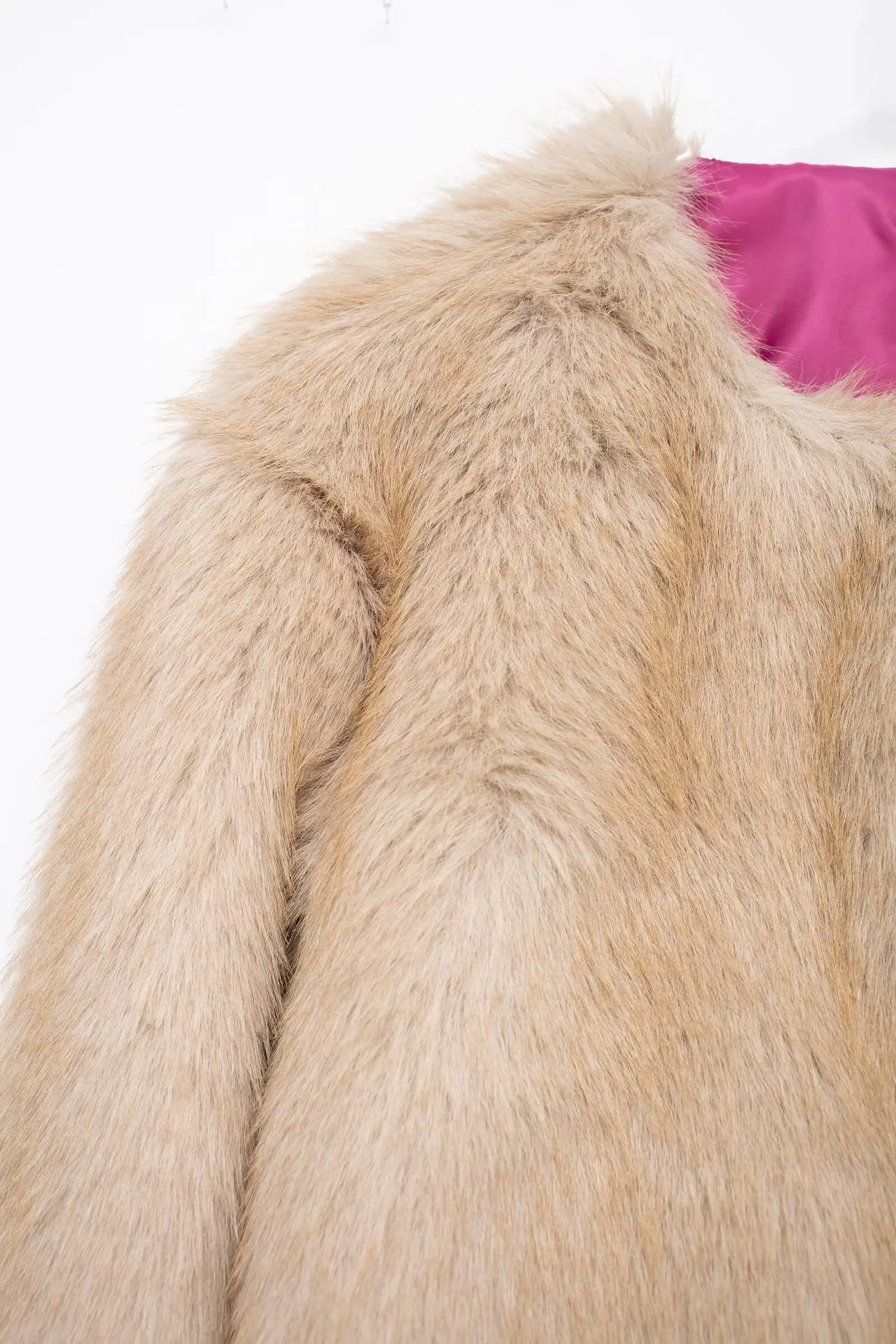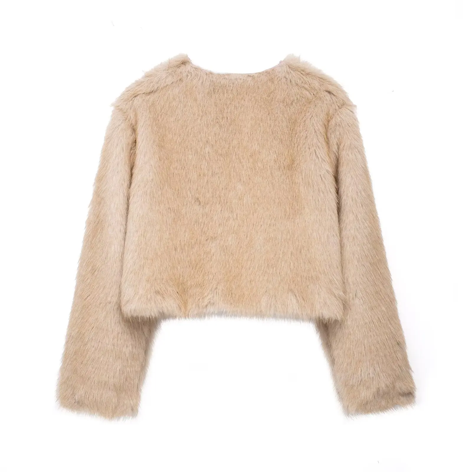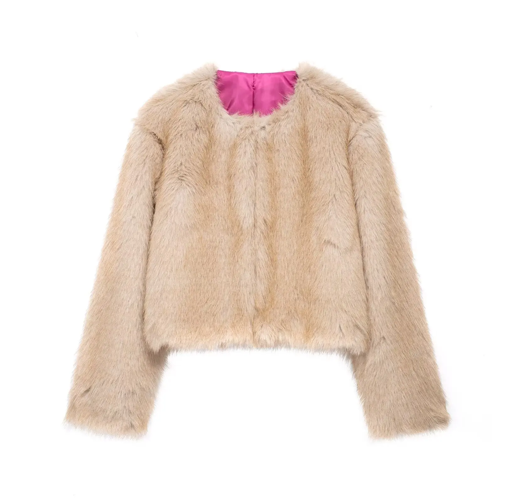 Women Faux Fur Cream Vintage Round Collar Jacket