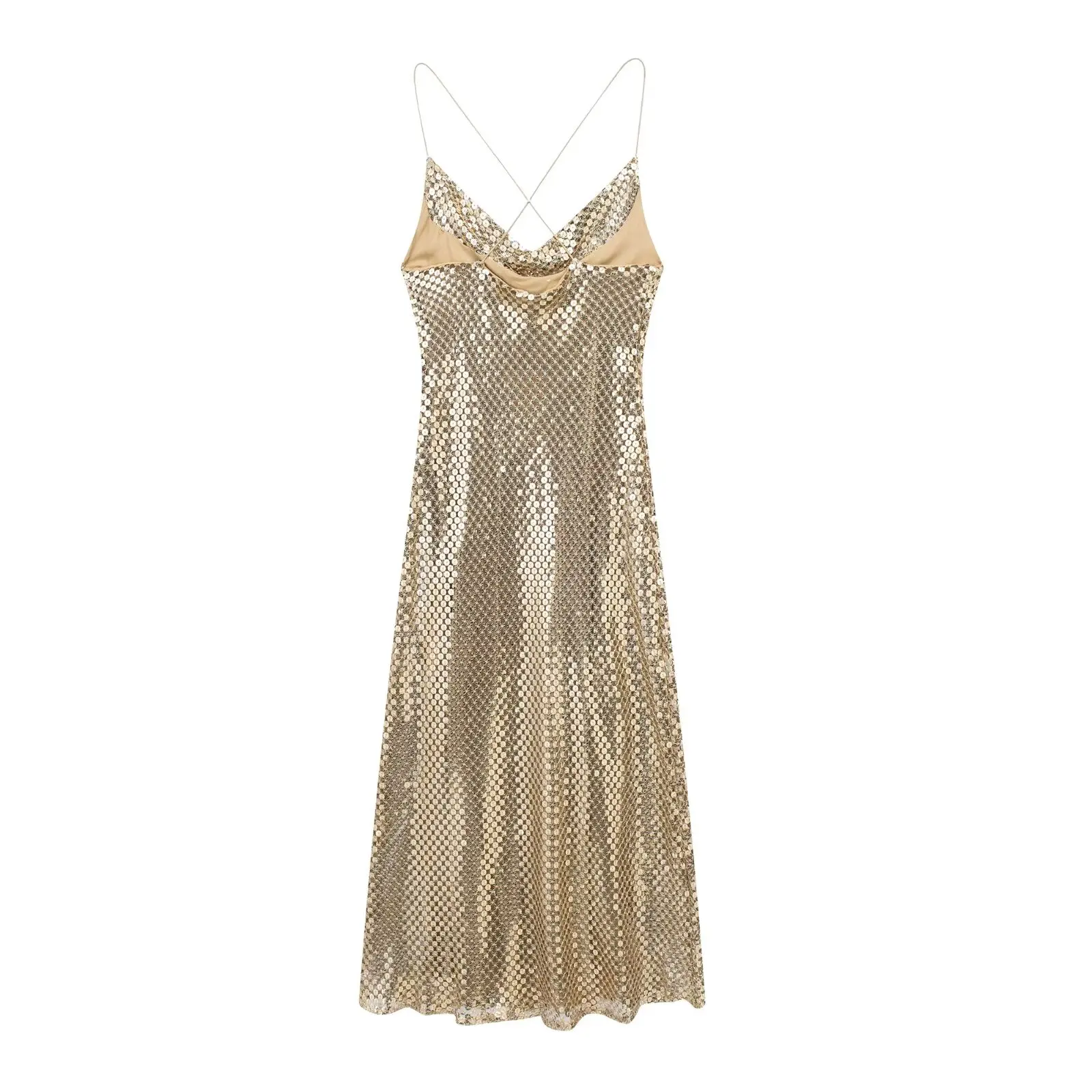 Womens Gold Mesh Spaghettini Strap Backless Slim Mini Party Dress