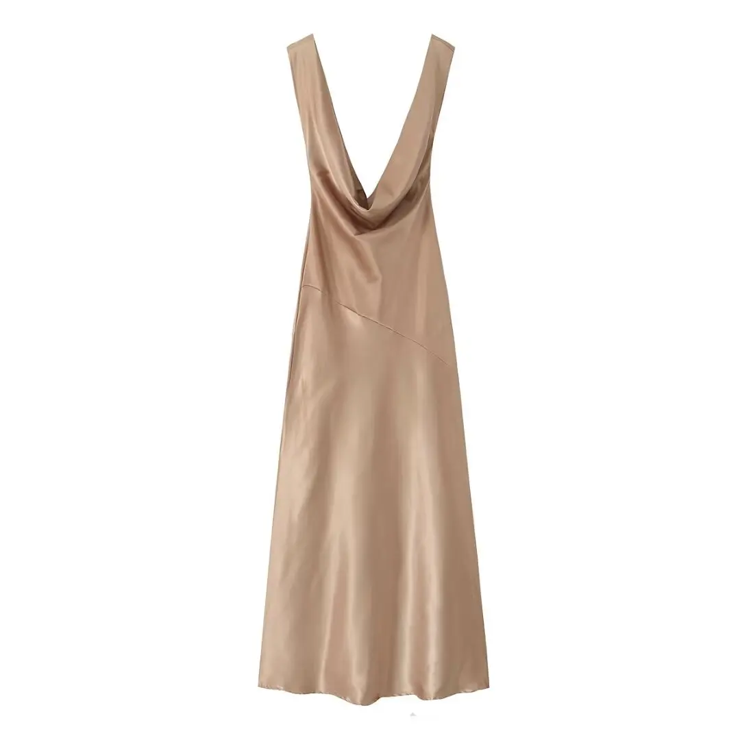 Womens Silk Satin Glam Low Cut Backless Midi Dress in Champagne Gold