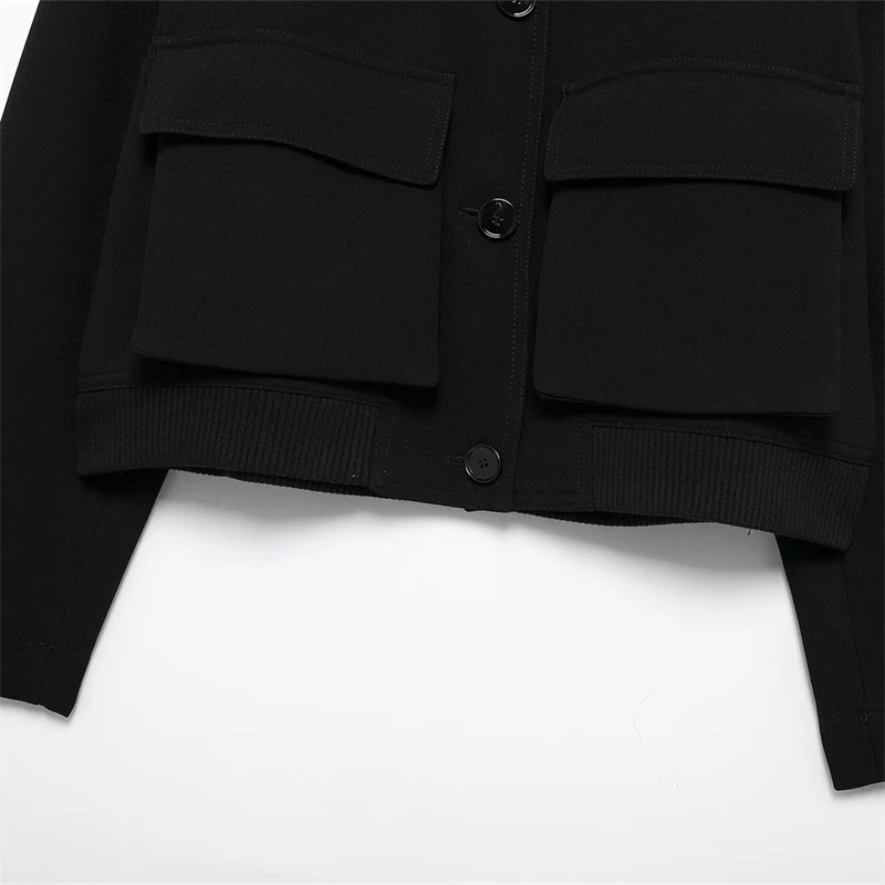Women’s Black Bright Line Loose Cropped Jacket – Safari Style, Single Breasted Blazer with Flap Pockets