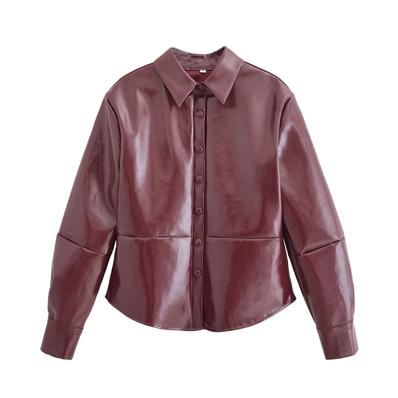 Womens Glossy Faux leather Jacket Street style Single Breasted Patchwork Slim Cropped Shirt Coat