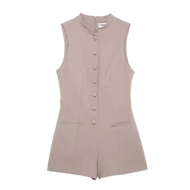 Women’s Khaki Single-Breasted Sleeveless Romper – Round Neck, Straight Leg Shorts Jumpsuit