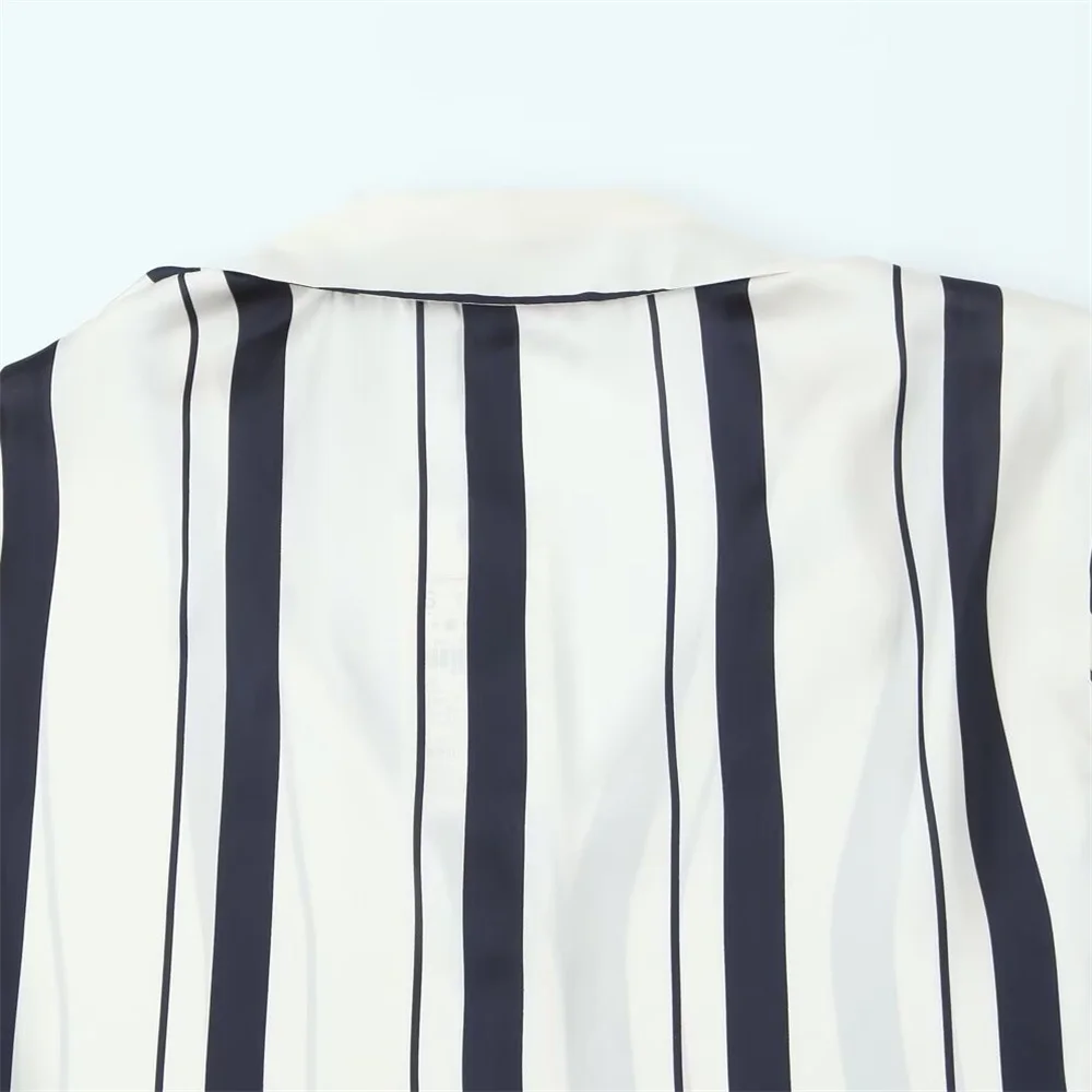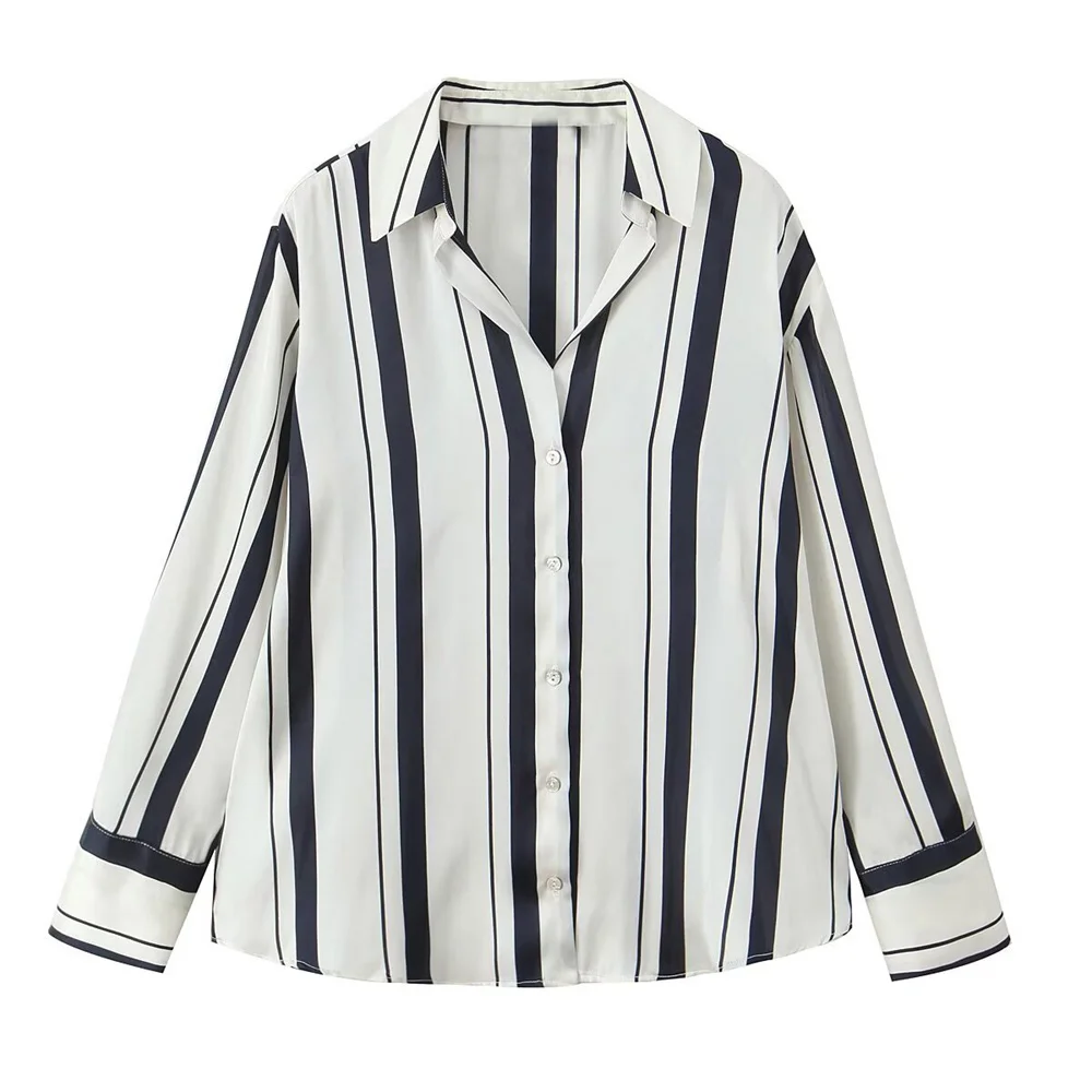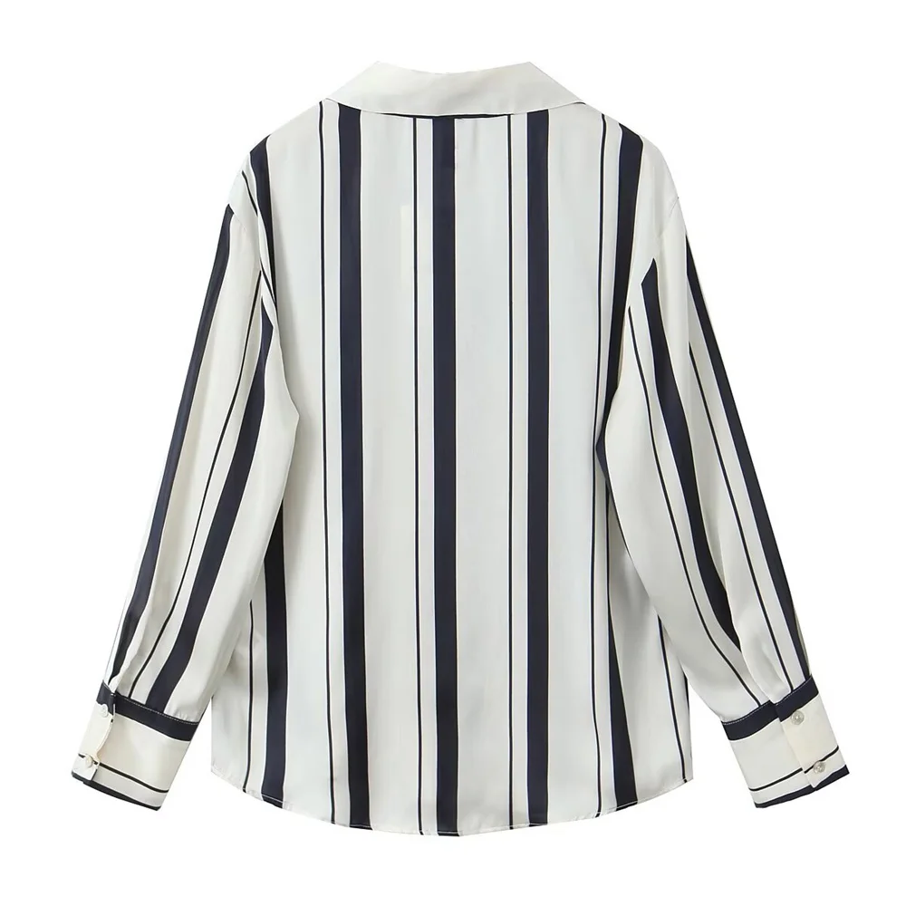 Zach Women’s Casual Loose Collar Long Sleeve Striped Silk Texture Shirt in Black and White