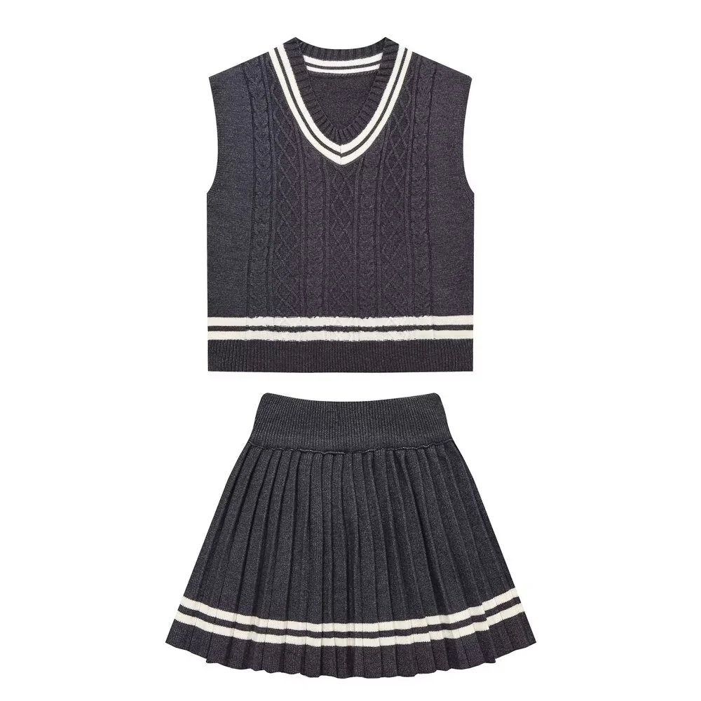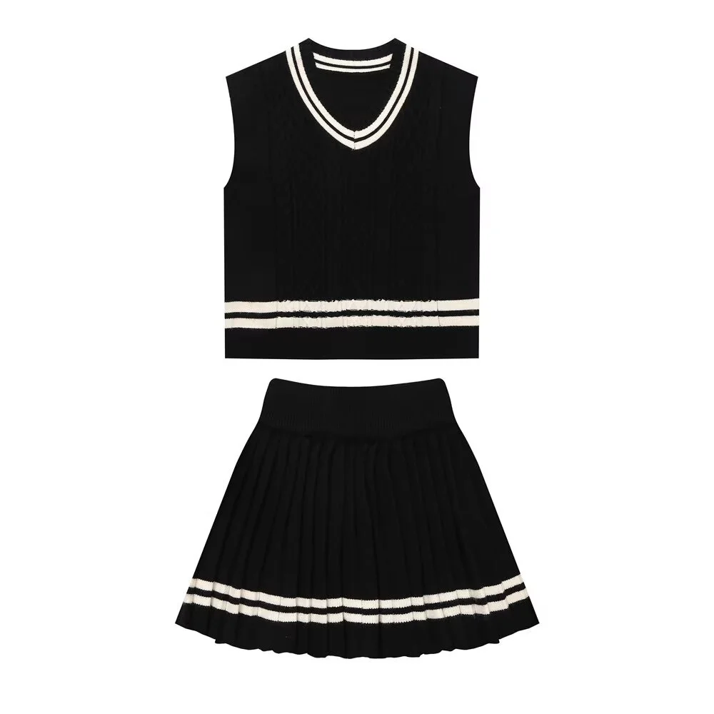 Zach Women’s V-Neck Contrast Color Knitted Vest & High-Waist Pleated Skirt Set