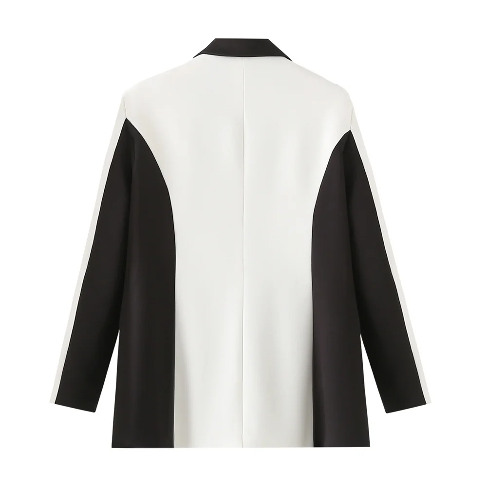 - High-Waist Black and White Pants: The high-waisted, sleek design of the pants elongates the legs and pairs perfectly with the suit coat for a coordinated, polished outfit. The black-and-white coloring adds a chic contrast, making this set ideal for a variety of occasions.