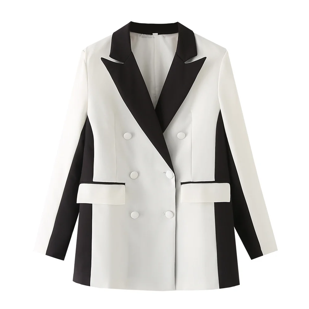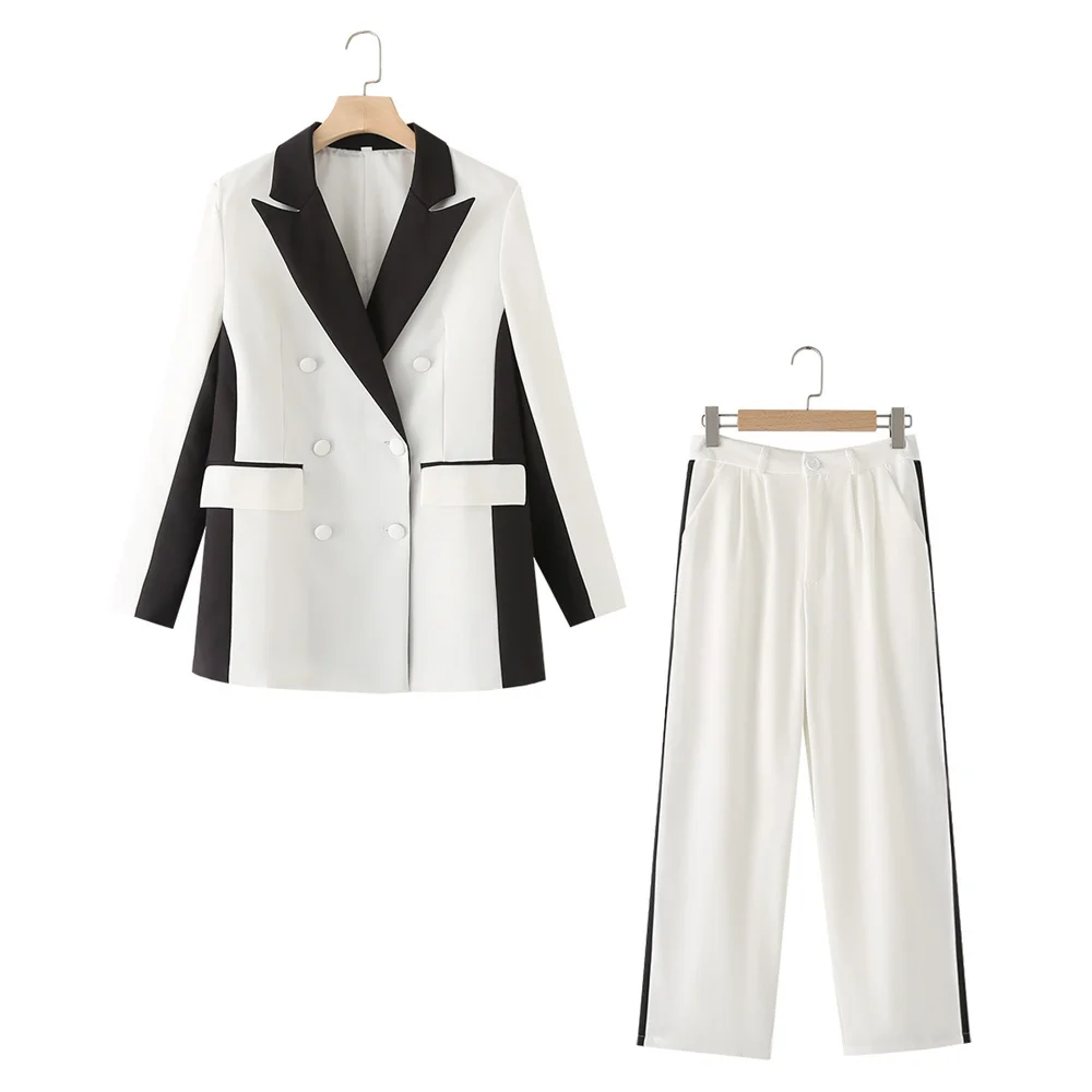 Zach Women’s Versatile Double-Breasted Suit Coat with High Waist Black White Pants Casual Set